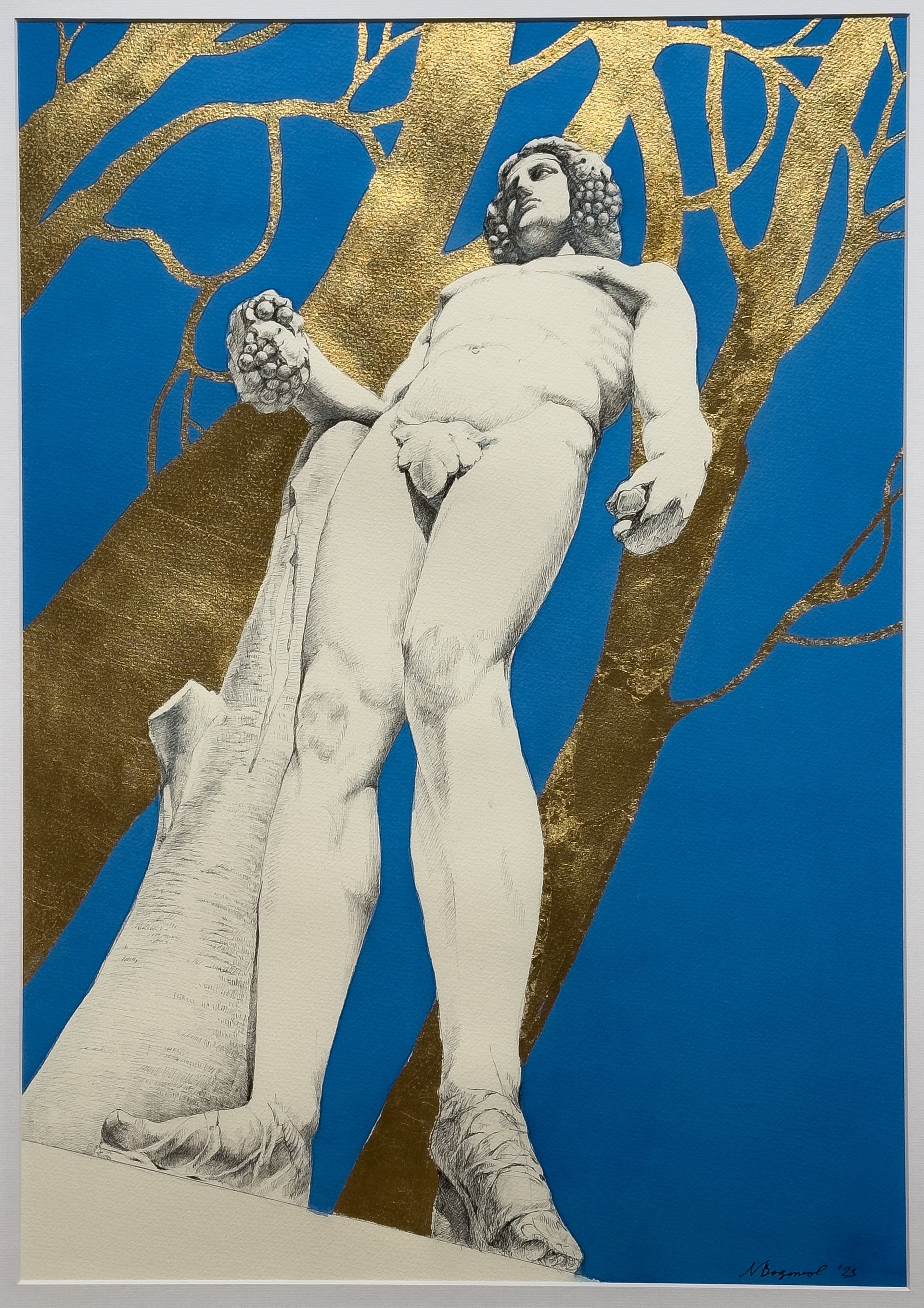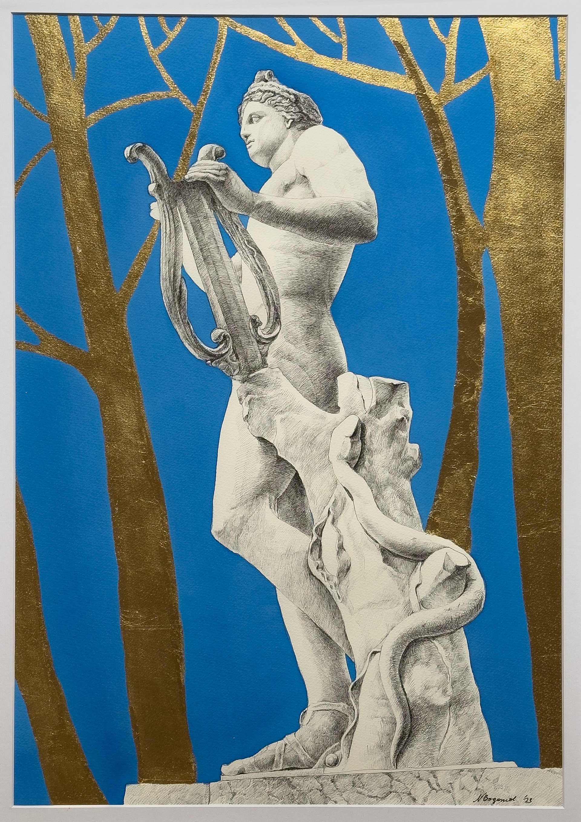 Mixed technique — Chinese ink, pen, watercolour and golden leaf. A unique drawing capturing a classical statue from a Versailles park. Fine work on superb famous English Saunders Waterford watercolour paper.